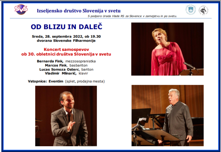 Vabimo vas na koncert samospevov "Od blizu in daleč", ki bo v sredo, 28. sept, v Slovenski filharmoniji.